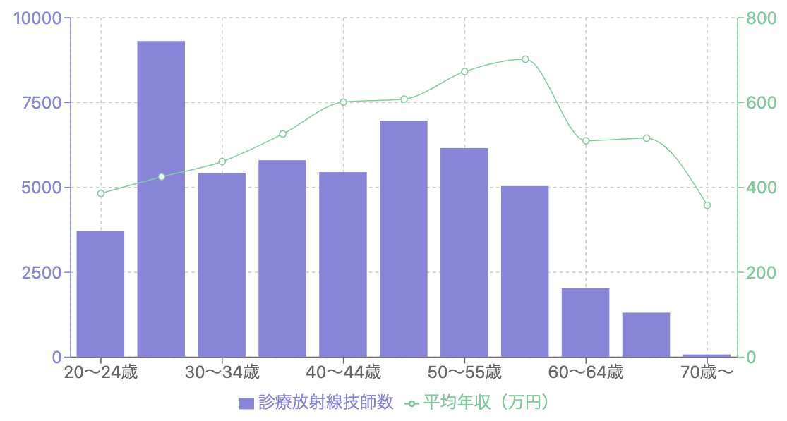 このグラフは、全年齢のデータを除いた診療放射線技師の年齢層別の平均年収と人数を表しています。青い棒グラフは各年齢層の診療放射線技師の人数を、緑の折れ線グラフは平均年収(万円)を示しています。