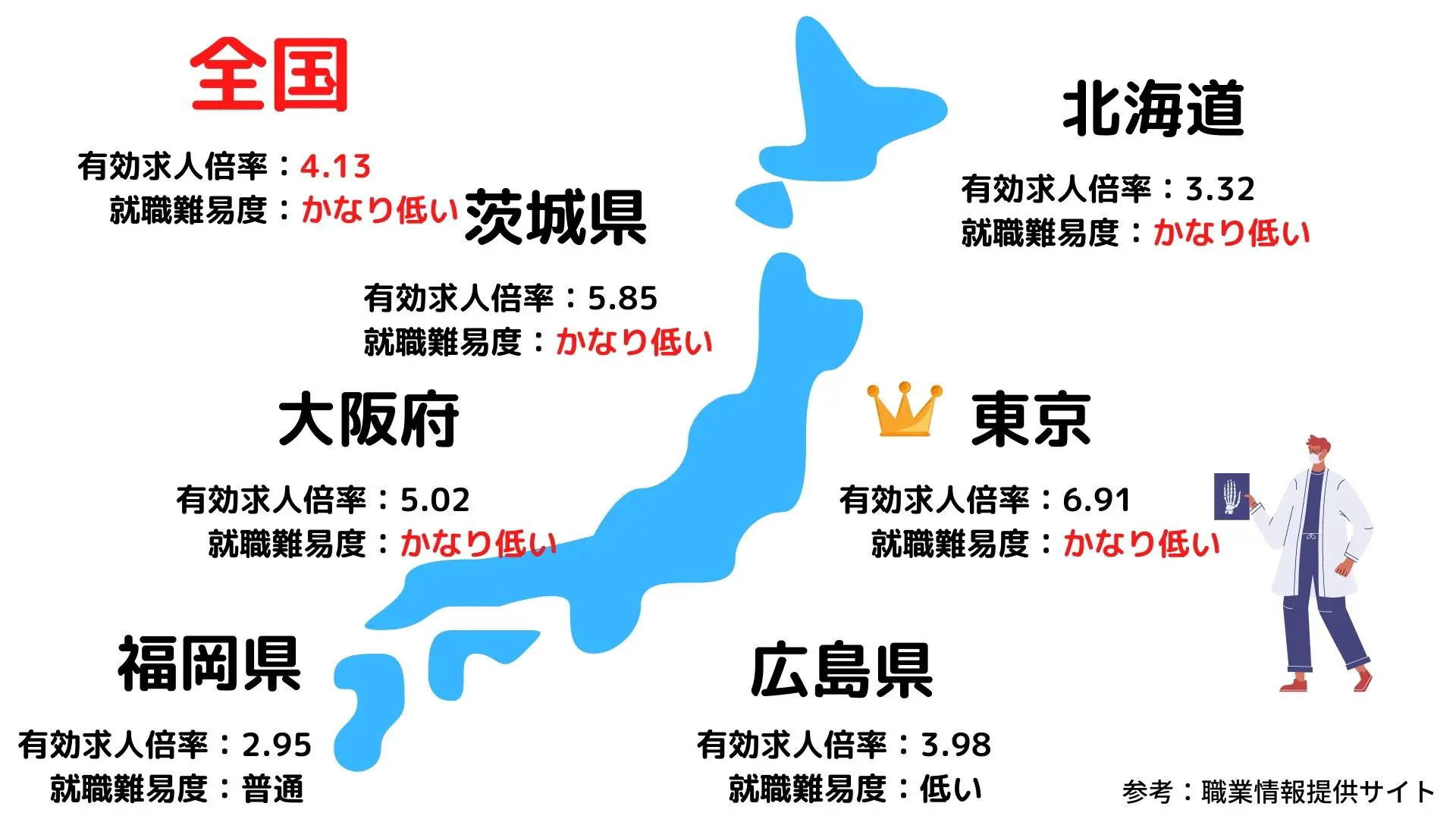 理学療法士の有効求人倍率は、他の医療職と比較しても高いことが多く、放射線技師や臨床検査技師のように就職先に困ることはありません。